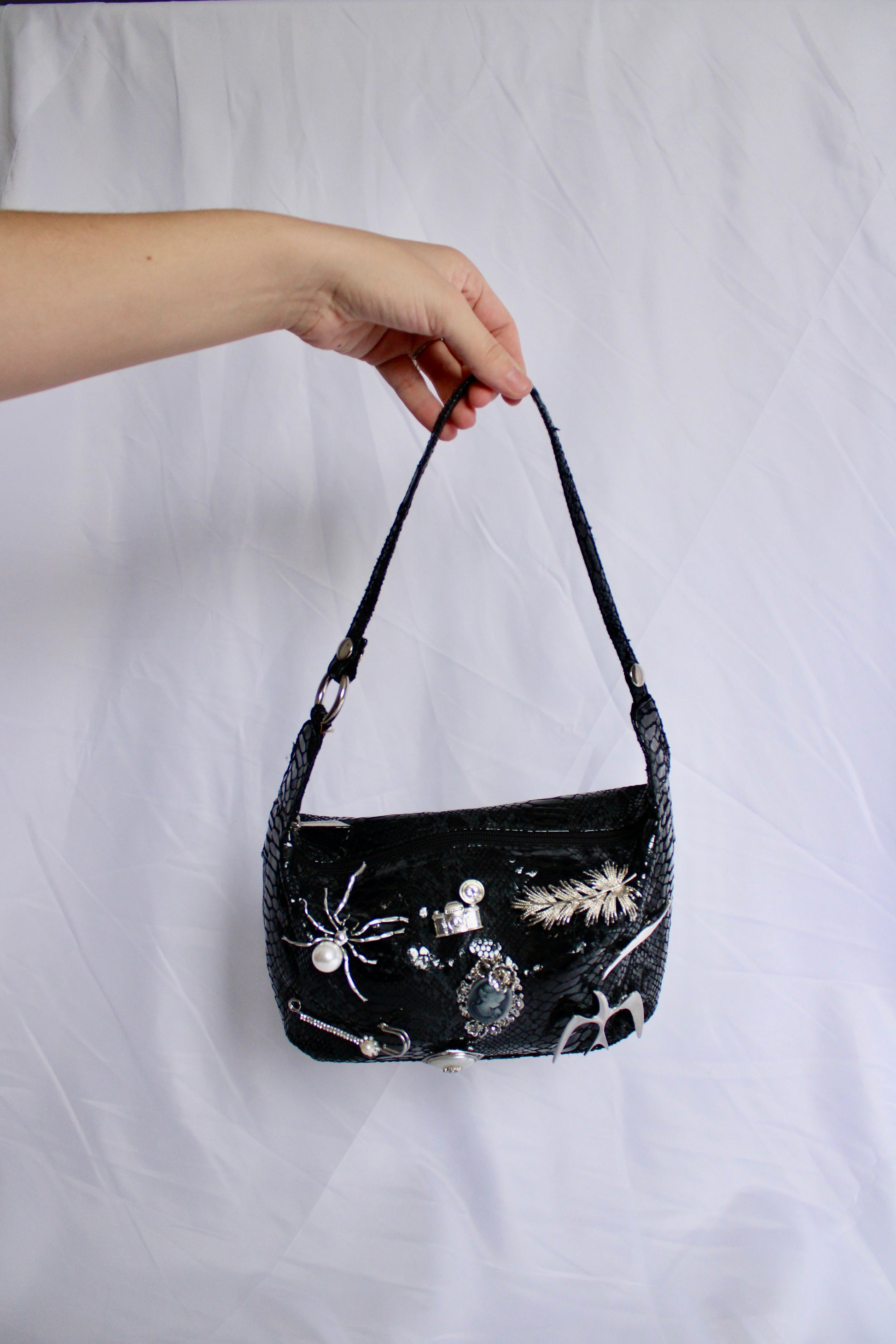 Step into timeless style with this truly one of a kind handbag! Created with unique, vintage brooches, this bag exudes personality and charm. Each brooch was carefully hand picked and placed, by myself! Turn heads wherever you go when you are carrying this wearable piece of art <3
